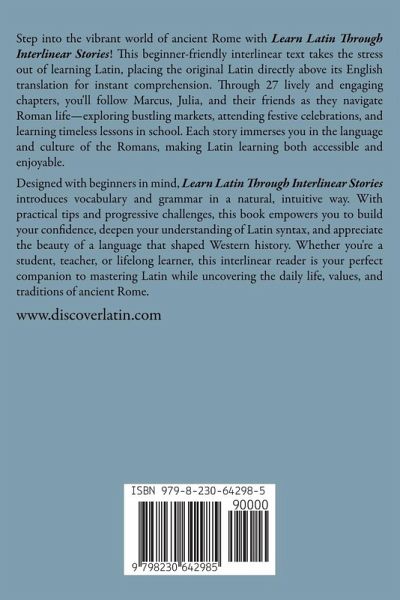 Learn Latin the Smart Way: A Beginner's Journey Through Interlinear Stories Discover the fascinating world of ancient Rome and its language with this beginner-friendly Latin-English interlinear reader! About the Book "Learn Latin Through Interlinear Stories" is the perfect companion for those new to Latin, offering 27 engaging chapters that bring Roman culture to life through relatable, everyday topics. From the bustling Roman Forum to countryside villas, each chapter is packed with vibrant stories that immerse you in the daily lives, customs, and values of ancient Romans. Whether you're reading about family life, Roman gods, or festive celebrations, this reader combines language learning with cultural discovery, making Latin both accessible and enjoyable. The Interlinear Advantage This book uses the innovative Latin-English interlinear format, where the Latin text is directly above its English translation. This unique layout offers multiple benefits for language learners:Immediate Context Understanding: See how Latin sentences flow, and grasp word meanings in real-time without constantly flipping through a dictionary. Grammar in Action: Observe Latin's cases, conjugations, and word endings in context, demystifying complex grammar rules. Vocabulary Retention: Encounter repeated vocabulary naturally across different stories, helping words stick without tedious memorization. Intuitive Learning: Gradually build an understanding of sentence structure and syntax by seeing Latin in its natural form. Why Learn Latin with This Book?Designed for Beginners: Written specifically for first-year learners, this book assumes no prior knowledge and progresses in difficulty, ensuring a smooth learning curve. Engaging Stories: Each chapter is more than a grammar exercise-it's a doorway into the ancient Roman world, from school life and games to celebrations and legends. Practical Learning Tips: Includes strategies for maximizing your use of the interlinear format, such as reading aloud, identifying patterns, and summarizing stories in Latin. Cultural Insight: Gain a deeper appreciation for Roman civilization as you explore their language alongside their values, history, and everyday routines. Versatile Learning Resource: Whether you're supplementing a Latin course or self-studying, this reader provides a practical and enjoyable way to practice reading and comprehension. Key Features27 topical chapters covering a wide range of relatable and intriguing subjects. Stories rich in cultural context, providing an authentic glimpse into Roman life. Step-by-step progression to build confidence and mastery. Encourages active engagement with exercises like summarization and reflection. Embrace the Language of Ancient Rome! With the "Learn Latin Through Interlinear Stories" you'll not only learn Latin-you'll experience it. Whether you're a student, teacher, or enthusiast of classical languages, this book is your gateway to a rich and rewarding journey into one of history's most influential languages. Take your first step today and unlock the secrets of Latin in a way that's both fun and effective! Perfect for:Latin beginners Homeschoolers Classical studies enthusiasts History lovers Start your Latin learning adventure with First Latin Reader-where language meets culture!
