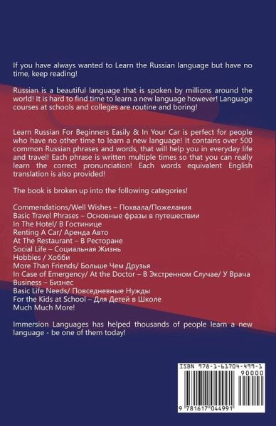 If you have always wanted to Learn the Russian language but have no time, keep reading! Russian is a beautiful language that is spoken by millions around the world! It is hard to find time to learn a new language however! Language courses at schools and colleges are routine and boring! Learn Russian For Beginners Easily & In Your Car is perfect for people who have no other time to learn a new language! It contains over 500 common Russian phrases and words, that will help you in everyday life and travel! Each phrase is written multiple times so that you can really learn the correct pronunciation! Each words equivalent English translation is also provided! The book is broken up into the following categories! Commendations/Well Wishes - ¿¿¿¿¿¿¿/¿¿¿¿¿¿¿¿¿ Basic Travel Phrases - ¿¿¿¿¿¿¿¿ ¿¿¿¿¿ ¿ ¿¿¿¿¿¿¿¿¿¿¿ In The Hotel/ ¿ ¿¿¿¿¿¿¿¿¿ Renting A Car/ ¿¿¿¿¿¿ ¿¿¿¿ At The Restaurant - ¿ ¿¿¿¿¿¿¿¿¿ Social Life - ¿¿¿¿¿¿¿¿¿¿ ¿¿¿¿¿ Hobbies / ¿¿¿¿¿ More Than Friends/ ¿¿¿¿¿¿ ¿¿¿ ¿¿¿¿¿¿ In Case of Emergency/ At the Doctor - ¿ ¿¿¿¿¿¿¿¿¿¿ ¿¿¿¿¿¿/ ¿ ¿¿¿¿¿ Business - ¿¿¿¿¿¿ Basic Life Needs/ ¿¿¿¿¿¿¿¿¿¿¿¿ ¿¿¿¿¿ For the Kids at School - ¿¿¿ ¿¿¿¿¿ ¿ ¿¿¿¿¿ Much Much More! Immersion Languages has helped thousands of people learn a new language - be one of them today!