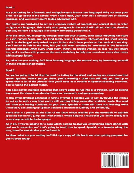 Learn Spanish with Short Stories Volume 1 & 2 ! Enjoy 2 FREE gifts with your purchase of this book: a mastermind group membership and a special report for planning the life of your dreams. Book 1 Are you looking for a fantastic and in-depth way to learn a new language? Why not treat your brain and go about it the natural way? That's right, your brain has a natural way of learning language, and you simply aren't taking advantage of it. Our brains are hardwired to act on a complex system of concepts and context clues to figure out language. Therefore, most polyglots in the world will tell you that the absolute best way to learn a language is by simply immersing yourself in it. With this book, you'll be going through different short stories, all of which following the story of a girl named Maria and her kind family from El Salvador. Throughout the short stories, you'll be challenged and pushed to your limits - that's how you know the method is working. You'll never be left in the dust, but you will most certainly be immersed in the beautiful Spanish language. After every short story, there's an English version, in case you got totally lost, and a section with grammar tips and vocabulary to help you round out every short story with a proper lesson. Book 2 So, you're going to be hitting the road (or taking to the skies) and ending up somewhere that speaks Spanish. Before you get there, you're wanting a book that will help you feel up to speed with a lot of the phrases that you'll need as a traveler in Spanish-speaking countries. You've found the perfect match. This book covers multiple scenarios that you're going to run into as a traveler, such as picking bags up at the airport, purchasing food at a restaurant, and going shopping. It also offers limitless potential in terms of what it enables you to say, by having the stories be set up in such a way that you're still learning things even after multiple reads. One read will have you feeling confident in your basic Spanish - more will have you learning extra vocabulary and picking up Spanish sentence structure intuitively and effectively. Don't wait another minute to access this quick and powerful guide to Learn Spanish order your copy today! It's fast and easy to purchase this fascinating book - just scroll up the right-hand side of your screen and click on the BUY NOW WITH ONE CLICK button.