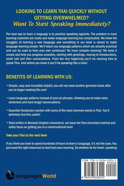If you have always wanted to learn Thai quickly but find it too overwhelming or complicated then keep reading … Thai is a fun language to learn, the problem is most learning materials are costly and make language learning too complicated. They start of good but then advance too quickly. Just like those dreaded language classes in school. The result, nothing sinks in, you become overwhelmed and eventually give up. We know learning a foreign language isn’t easy, it challenges both your brain and your time. Learning new concepts and setting aside time for your learning can be difficult. And if you’re studying with bad material you can end up getting stuck more than necessary, which isn’t fun. Most students feel to start learning a language you simply need to start. That’s true but it’s better to first find the right resources to help you progress smoothly. Otherwise it can be a real motivation killer. If these are problems you’ve faced, don’t worry we’re here for you. The days of difficult learning are long gone! We’ve created this book which aims to make language learning simple. We teach you language patterns and grammar structures which can be used to form your own sentences. Instead of set phrases, which aren’t very practical. No more complex learning! We keep it simple topic to topic and help you progress through Thai smoothly. Starting with greetings, moving to introductions, small talk and then conversations. From the very beginning you’ll be learning how to speak Thai . And before you know it you’ll be speaking like a boss! In this book you will discover: • Simple and smooth approach to Thai with topics that slowly build on each other. You won’t need another grammar book after you’ve begun reading this one! • Learn how to form your own sentences instead of just set phrases, allowing you to have longer more fun conversations. • Essential vocabulary section with some of the most common words in Thai. You’ll definitely find this useful! • Totally written in romanji (English characters) , we leave the reading and writing of Thai behind and solely focus on getting you to a conversational speaking level. Even if you’ve struggled to learn Thai for years and years, this book gives you the missing piece you need towards your fluency journey. So if you want to learn Thai fast and painlessly pick up a copy today.