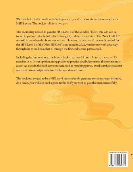 The book aims to help beginner English language learners practice basic Chinese words and characters. This workbook allows you to practice the vocabulary required for the HSK 1 exam. The book is divided into two parts. The vocabulary required to pass HSK Level 1 of the so-called "New HSK 2.0" is found in Part 1, which includes Units 1-6, and the first revision. Despite being declared obsolete in 2021, the "New HSK 2.0" was still in use at the time this book was written. However, to practice all of the words required for HSK Level 1 of the "New HSK 3.0" announced in March 2021, you must go through the entire book, including the first and second parts. Including the four revisions, the book is broken up into 25 units. In total, there are 125 exercises in it. In our opinion, using puzzles to practice vocabulary makes the process much easier. As a result, the book contains exercises like matching games, word searches (character searches), crossword puzzles, word fill-ins, and more. The book was created to be a HSK word practice book; grammar exercises are not included. As a result, you will also need a good textbook if you want to pass the exam successfully. I think it's possible for learning to be entertaining, and I hope you will enjoy and benefit from the exercises in this book.