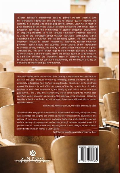 Teacher education programmes seek to provide student teachers with the knowledge, disposition and expertise to provide quality teaching and learning in a diverse and challenging school context. Learning to Teach in post-apartheid South Africa: Student Teachers' Encounters with Initial Teacher Education addresses the complexities of teacher education programmes in preparing students to teach through empirically informed research. It adds to the knowledge about teacher education, contributing critical understanding of education and the schooling system. The book provides important insights to deepen researchers, academics, teacher education providers, policy-makers, and students' understanding of the importance to address equity, redress, and quality in South African education in a postapartheid era. This book further helps to build student teachers' capacities to work creatively and to become active and critical agents of transformation. It ultimately outlines the challenges faced in designing and delivering successful Initial Teacher Education programmes, and the impact this has on delivering equitable and quality education.