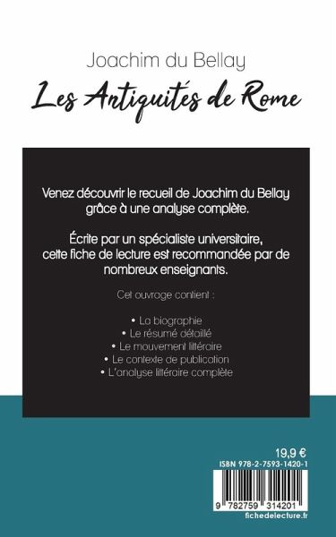 Venez découvrir Les Antiquités de Rome de Joachim du Bellay grâce à une analyse littéraire de référence ! Écrite par un spécialiste universitaire, cette fiche de lecture est recommandée par de nombreux enseignants. Cet ouvrage contient la biographie de l'écrivain, le résumé détaillé, le mouvement littéraire, le contexte de publication de l'oeuvre et l'analyse complète. Retrouvez tous nos titres sur : www.fichedelecture.fr.