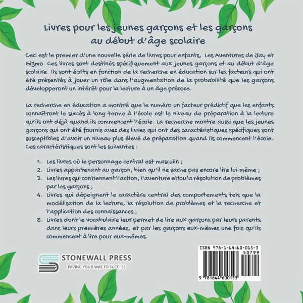 Livres pour les jeunes garçons et les garçons au début d'âge scolaire Ceci est le premier d'une nouvelle série de livres pour enfants, Les Aventures de Jay et Gizmo. Ces livres sont destinés spécifiquement aux jeunes garçons et au début d'âge scolaire. Ils sont écrits en fonction de la recherche en éducation sur les facteurs qui ont été présentés à jouer un rôle dans l'augmentation de la probabilité que les garçons développeront un intérêt pour la lecture à un âge précoce. La recherche en éducation a montré que le numéro un facteur prédictif que les enfants connaîtront le succès à long terme à l'école est le niveau de préparation à la lecture qu'ils ont déjà quand ils commencent l'école. La recherche montre aussi que les jeunes garçons qui ont été fournis avec des livres qui ont des caractéristiques spécifiques sont susceptibles d'avoir un niveau plus élevé de préparation quand ils commencent l'école. Ces caractéristiques sont les suivantes : Les livres où le personnage central est masculin ; Livres appartenant au garçon, bien qu'il ne sache pas encore lire lui-même ; Les livres qui contiennent l'action, l'aventure et/ou la résolution de problèmes par les garçons ; Livres qui dépeignent le caractère central des comportements tels que la modélisation de la lecture, la résolution de problèmes et la recherche et l'application des connaissances ; Livres dont le vocabulaire leur permet de lire aux garçons par leurs parents dans leurs premières années, et par les garçons eux-mêmes une fois qu'ils commencent à lire pour eux-mêmes.