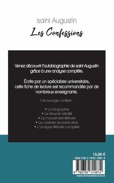 Venez découvrir Les Confessions de Saint Augustin grâce à une analyse littéraire de référence ! Écrite par un spécialiste universitaire, cette fiche de lecture est recommandée par de nombreux enseignants. Cet ouvrage contient la biographie de l'écrivain, le résumé détaillé, le mouvement littéraire, le contexte de publication de l'oeuvre et l'analyse complète. Retrouvez tous nos titres sur : www.fichedelecture.fr.
