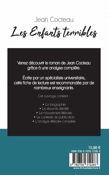 Venez découvrir Les Enfants terribles de Jean Cocteau grâce à une analyse littéraire de référence ! Écrite par un spécialiste universitaire, cette fiche de lecture est recommandée par de nombreux enseignants. Cet ouvrage contient la biographie de l'écrivain, le résumé détaillé, le mouvement littéraire, le contexte de publication de l'oeuvre et l'analyse complète. Retrouvez tous nos titres sur : www.fichedelecture.fr.