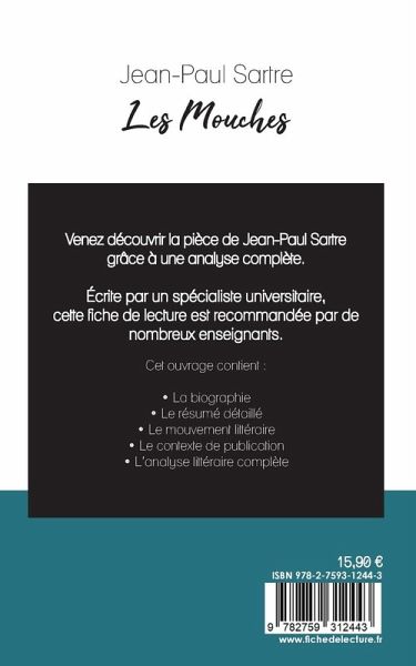 Venez découvrir Les Mouches de Jean-Paul Sartre grâce à une analyse littéraire de référence ! Écrite par un spécialiste universitaire, cette fiche de lecture est recommandée par de nombreux enseignants. Cet ouvrage contient la biographie de l'écrivain, le résumé détaillé, le mouvement littéraire, le contexte de publication de l'oeuvre et l'analyse complète. Retrouvez tous nos titres sur : www.fichedelecture.fr.