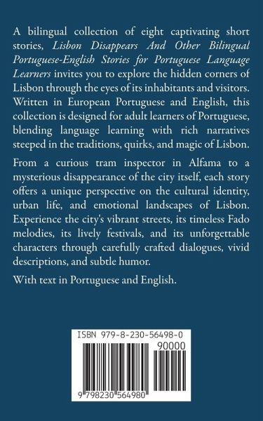 A bilingual collection of eight captivating short stories, Lisbon Disappears And Other Bilingual Portuguese-English Stories for Portuguese Language Learners invites you to explore the hidden corners of Lisbon through the eyes of its inhabitants and visitors. Written in European Portuguese and English, this collection is designed for adult learners of Portuguese, blending language learning with rich narratives steeped in the traditions, quirks, and magic of Lisbon. From a curious tram inspector in Alfama to a mysterious disappearance of the city itself, each story offers a unique perspective on the cultural identity, urban life, and emotional landscapes of Lisbon. Experience the city's vibrant streets, its timeless Fado melodies, its lively festivals, and its unforgettable characters through carefully crafted dialogues, vivid descriptions, and subtle humor. With text in Portuguese and English.