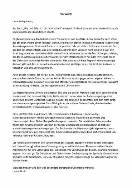 Das Hasenmädchen Lilly und der Enterich Billy sind die besten Freunde. Aber auch beste Freunde streiten mal. Und das so richtig dolle. Beide sind sich sicher, dass der andere angefangen hat und schuld an dem Ganzen ist... In dem Kinderbuch "Lilly und Billy - Ich bin nicht schuld" erleben die Kinder, dass die Frage nach der Schuld - selbst von außen betrachtet - nicht so leicht zu beantworten ist. Sie lernen aber auch, dass dies gar nicht so wichtig ist, wie eine Lösung zu finden, dass erzwungene Entschuldigungen keinen Sinn machen und Gewalt nie eine Lösung ist. Dieses Literaturprojekt zum Buch regt die Kinder mit lesebegleitenden, dreifach differenzierten Arbeitsblättern und fächerübergreifenden Unterrichtsideen an, noch tiefer in die Materie rund um Freundschaft, Gefühle, Streit und Vertragen einzutauchen. Neben den Arbeitsblättern, die den Fächern Deutsch, Religion und Sachunterricht zugeordnet werden können, gibt es auch Tipps und Ideen für den Musik- oder Kunstunterricht.