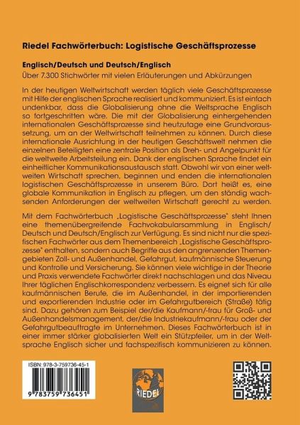 Riedel Fachwörterbuch: Logistische Geschäftsprozesse Englisch/Deutsch und Deutsch/Englisch Über 7.250 Stichwörter mit vielen Erläuterungen und Abkürzungen In der heutigen Weltwirtschaft werden täglich viele Geschäftsprozesse mit Hilfe der englischen Sprache realisiert und kommuniziert. Es ist einfach undenkbar, dass die Globalisierung ohne die Weltsprache Englisch so fortgeschritten wäre. Die mit der Globalisierung einhergehenden internationalen Geschäftsprozesse sind heutzutage eine Grundvoraussetzung, um an der Weltwirtschaft teilnehmen zu können. Durch diese internationale Ausrichtung in der heutigen Geschäftswelt nehmen die einzelnen Beteiligten eine zentrale Position als Dreh- und Angelpunkt für die weltweite Arbeitsteilung ein. Dank der englischen Sprache findet ein einheitlicher Kommunikationsaustausch statt. Obwohl wir von einer weltweiten Wirtschaft sprechen, beginnen und enden die internationalen logistischen Geschäftsprozesse in unserem Büro. Dort heißt es, eine globale Kommunikation in Englisch zu pflegen, um den ständig wachsenden Anforderungen der weltweiten Wirtschaft gerecht zu werden. Mit dem Fachwörterbuch "Logistische Geschäftsprozesse" steht Ihnen eine themenübergreifende Fachvokabularsammlung in Englisch/Deutsch und Deutsch/Englisch zur Verfügung. Es sind nicht nur die spezifischen Fachwörter aus dem Themenbereich "Logistische Geschäftsprozesse" enthalten, sondern auch Begriffe aus den angrenzenden Themengebieten Zoll- und Außenhandel, Gefahrgut, kaufmännische Steuerung und Kontrolle und Versicherung. Sie können viele wichtige in der Theorie und Praxis verwendete Fachwörter direkt nachschlagen und das Niveau Ihrer täglichen Englischkorrespondenz verbessern. Es eignet sich für alle kaufmännischen Berufe, die im Außenhandel, in der importierenden und exportierenden Industrie oder im Gefahrgutbereich (Straße) tätig sind. Dazu gehören zum Beispiel der/die Kaufmann/-frau für Groß- und Außenhandel, der/die Industriekaufmann/-frau oder der Gefahrgutbeauftragte im Unternehmen. Dieses Fachwörterbuch ist in einer immer stärker globalisierten Welt ein Stützpfeiler, um in der Weltsprache Englisch sicher und fachspezifisch kommunizieren zu können.