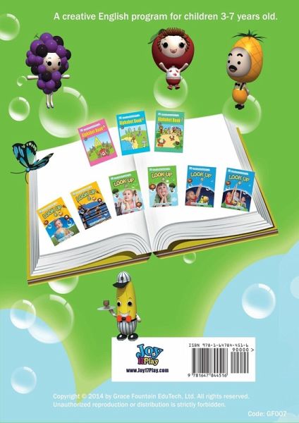 Look Up English Book 1-6 are a series of English textbooks designed for 3-7 years old children of different learning types. These six books are based on basic English words and daily expressions used in normal communication. "3-Is: Illustration, Interesting, Interaction" are the main features of these Look Up books. All the 3D Joy Family Vegetable & Fruit characters are very lovely and international. Their vivid illustrations and interactions in these exquisite books with live-action films, chants, and songs with animation are designed for visual, auditory, kinesthetic and tactile learning styles students to learn English. In addition, the multimedia contents and platform we provide are also an interesting and important supplementary for kids to learn and play. Look Up Alphabet Book 1-3 are based on the alphabet. The series aims to help children to master the readings and writing methods of 26 letters. Each of these three books increases in difficulty from the alphabet to commonly used English words and short paragraphs. The unique modeling of 26 letters in the Look Up Alphabet Books will impress children and help them remember new words. Our catchy chants and funny stories will urge children to follow and imitate the reading to learn more new words by heart. The various kinds of interesting exercises in the Look Up Alphabet Books also keep children learning and playing in great joy. Grace Fountain EduTech Group is a specialized institution, which focuses on developing education products on children's teaching, nurturing and cultivating and commits to establishing a new entertaining media platform for children. With innovative education technology and new teaching idea, we aim to enhance the good moral character for children, explore potentials and creative power for them, expand their international vision and thinking skills, assist them to become the elites with good characters, manners, conducts and taste!