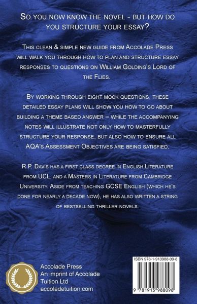 So you now know the novel - but how do you structure your essay? This clean & simple new guide from Accolade Press will walk you through how to plan and structure essay responses to questions on William Golding's Lord of the Flies. By working through eight mock questions, these detailed essay plans will show you how to go about building a theme based answer - while the accompanying notes will illustrate not only how to masterfully structure your response, but also how to ensure all AQA's Assessment Objectives are being satisfied. R.P. Davis has a First Class degree in English Literature from UCL, and a Masters in Literature from Cambridge University. Aside from teaching GCSE English (which he's done for nearly a decade now), he has also written a string of bestselling thriller novels.