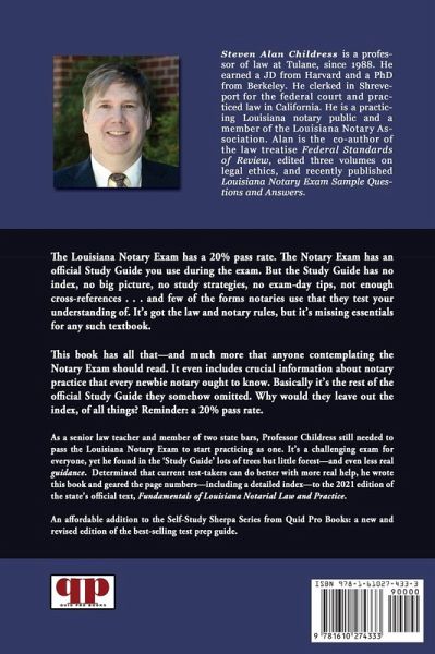 SUPERSEDED 2021 EDITION in hardcover of the best-selling notary prep guidebook to the difficult Louisiana exam. (NOTE: This one is keyed to the blue 2021 state textbook. Look for the newer, GREEN 2023 edition elsewhere on this website, unless you're using the 2021 state text.) The Louisiana Notary Exam has a 20% pass rate... The Notary Exam has an official Study Guide you use during the exam. But the Study Guide has no index, no big picture, no study strategies, no exam-day tips, not enough cross-references . . . and few of the forms notaries use that they test. It doesn't explain most-tested subjects, past exams, or recent changes to the Guide. It's got the law and notary rules, but it's missing essentials for any such textbook. This book has all that-and much more that anyone contemplating the exam should read. It even includes crucial information about notary practice for the newbie notary, and is useful to experienced notaries for its expanded cross-references, complete index, and summary lists. Basically it's the rest of the official Study Guide they somehow omitted. Why would they leave out the index, of all things? Reminder: a 20% pass rate. As a senior law teacher and member of two state bars, Professor Childress still needed to pass the Louisiana Notary Exam to practice as one. It's a challenging exam for everyone, yet he found in the 'Study Guide' lots of trees but little forest-and even less real guidance. Determined that current test-takers can do better with more real help, he wrote this book and geared the page numbers-including an index, cross-references, lists, and illustrated explanation of successions, community property, and authentic acts-to the latest edition of the state's official text, Fundamentals of Louisiana Notarial Law and Practice. An affordable addition to the Self-Study Sherpa Series from Quid Pro Books, that actually pays for itself, with its 'one weird trick' saying how to save $65 in fees in the notary qualification process.