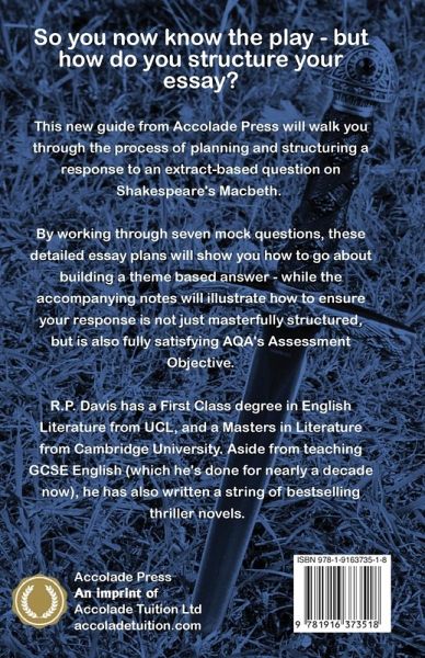 So you now know the play - but how do you structure your essay? This clean & simple new guide from Accolade Press will walk you through how to plan and structure essay responses to questions on Shakespeare's Macbeth. By working through seven mock questions, these detailed essay plans will show you how to go about building a theme based answer - while the accompanying notes will illustrate not only how to masterfully structure your response, but also how to ensure all AQA's Assessment Objectives are being satisfied. R.P. Davis has a First Class degree in English Literature from UCL, and a Masters in Literature from Cambridge University. Aside from teaching GCSE English (which he's done for nearly a decade now), he has also written a string of bestselling thriller novels.