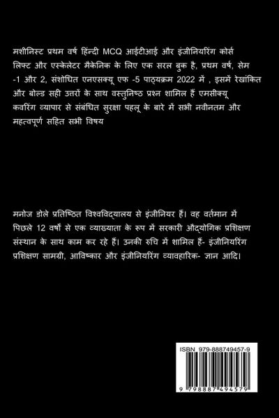 Machinist First Year Hindi MCQ is a simple e-Book for ITI & Engineering Course Lift and Escalator Mechanic, First Year, Revised NSQ F-5 Syllabus in 2022, It contains objective questions with underlined & bold correct answers MCQ covering all topics including all about the latest & Important about safety aspect related to the trade, basic fitting operations viz., making, filing, sawing, chiseling, drilling, tapping, grinding, different fits viz., sliding, T-fit and square fit, Lathe operation, turning operation including thread cutting, slotting machine and making different components, conventional milling machine with extensive coverage of different operations viz., plain, face, angular, form, gauge, straddle milling, square thread cutting, grinding operation (both surface and cylindrical) and lots more.