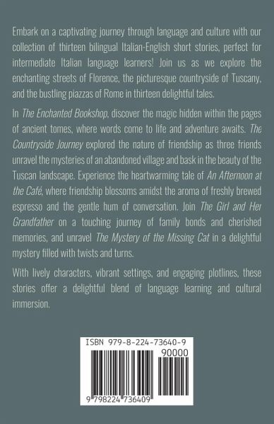 Embark on a captivating journey through language and culture with our collection of thirteen bilingual Italian-English short stories, perfect for intermediate Italian language learners! Join us as we explore the enchanting streets of Florence, the picturesque countryside of Tuscany, and the bustling piazzas of Rome in thirteen delightful tales. In The Enchanted Bookshop, discover the magic hidden within the pages of ancient tomes, where words come to life and adventure awaits. The Countryside Journey explored the nature of friendship as three friends unravel the mysteries of an abandoned village and bask in the beauty of the Tuscan landscape. Experience the heartwarming tale of An Afternoon at the Café, where friendship blossoms amidst the aroma of freshly brewed espresso and the gentle hum of conversation. Join The Girl and Her Grandfather on a touching journey of family bonds and cherished memories, and unravel The Mystery of the Missing Cat in a delightful mystery filled with twists and turns. With lively characters, vibrant settings, and engaging plotlines, these stories offer a delightful blend of language learning and cultural immersion.