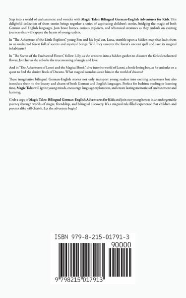Step into a world of enchantment and wonder with Magic Tales: Bilingual German-English Adventures for Kids. This delightful collection of short stories brings together a series of captivating children's stories, bridging the magic of both German and English languages. Join brave heroes, curious explorers, and whimsical creatures as they embark on exciting journeys that will capture the hearts of young readers. In "The Adventure of the Little Explorer," young Ben and his loyal cat, Luna, stumble upon a hidden map that leads them to an uncharted forest full of secrets and mystical beings. Will they uncover the forest's ancient spell and save its magical inhabitants? In "The Secret of the Enchanted Flower," follow Lilly, as she ventures into a hidden garden to discover the fabled enchanted flower. Join her as she unlocks the true meaning of magic and love. And in "The Adventures of Lenni and the Magical Book," dive into the world of Lenni, a book-loving boy, as he embarks on a quest to find the elusive Book of Dreams. What magical wonders await him in the world of dreams? These imaginative bilingual German-English stories not only transport young readers into exciting adventures but also introduce them to the beauty and charm of both German and English languages. Perfect for bedtime reading or learning time, Magic Tales will ignite young minds, encourage language exploration, and create lasting memories of enchantment and learning. Grab a copy of Magic Tales: Bilingual German-English Adventures for Kids and join our young heroes in an unforgettable journey through worlds of magic, friendship, and bilingual discovery. It's a magical tale-filled experience that children and parents alike will cherish. Let the adventure begin!