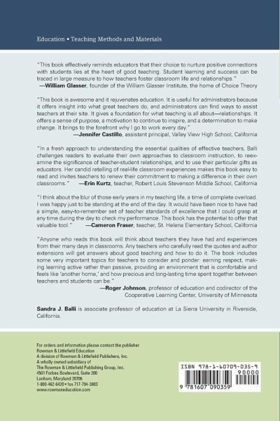 Balli is one of the most analytic and clear communicators about what it takes to become an extraordinary teacher. I think that she has nailed it. -- David Berliner, Regents? Professor, Mary Lou Fulton College of Education, Arizona State University This book effectively reminds educators that their choice to nurture positive connections with students lies at the heart of good teaching. Student learning and success can be traced in large measure to how teachers foster classroom life and relationships. -- William Glasser, founder of the William Glasser Institute, the home of Choice Theory In a fresh approach to understanding the essential qualities of effective teachers, Balli challenges readers to evaluate their own approaches to classroom instruction, to reexamine the significance of teacher-student relationships, and to use their particular gifts as educators. Her candid retelling of real life classroom experiences makes this book easy to read and invites teachers to renew their commitment to making a difference in their own classrooms. -- Erin Kurtz, teacher, Robert Louis Stevenson Middle School, California This book is awesome and it rejuvenates education. It is useful for administrators because it offers insight on what great teachers do, and administrators can find ways to assist teachers at their site. It gives a foundation for what teaching is all about-relationships. It offers a sense of purpose, a motivation to continue to inspire, and a determination to make change. It brings to the forefront why I go to work every day. -- Jennifer Castillo, assistant principal of Valley View High School, California I think about the blur of those early years in my teaching life, a time of complete overload. I was happy just to be standing at the end of the day. It would have been nice to have had a simple, easy to remember set of teacher standards of excellence that I could grasp at any time during the day to check my performance. This book has the potential to offer that valuable tool. -- Cameron Fraser, teacher, St. Helena Elementary School, California Anyone who reads this book will think about teachers they have had and experiences from their many days in classrooms. Any teachers who carefully read the quotes and author extensions will get answers about good teaching and how to do it. The book includes some very important topics for teachers to consider and ponder: earning respect, making learning active rather than passive, providing an environment that is comfortable and feels like 'another home,' and how precious and long-lasting time spent together between teachers and students can be. Prospective teachers will especially benefit by searching for jewels in this book like the importance of 'taking students seriously' and a classroom where 'It is fun here. Just look around.' -- Roger Johnson, professor of education and codirector of the Cooperative Learning Center at the University of Minnesota