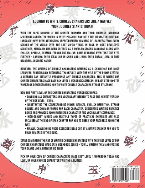 Looking to write Chinese characters like a native? Your journey starts today! With the rapid growth of the Chinese economy and their business influence spreading across the world in every possible way, both the Chinese culture and language have been attracting unprecedented numbers of learners from every corner of the world over the last 20-30 years. In fact, in most developed countries, Mandarin has been offered as a popular second language along with English, Spanish, German, French and Italian. Some learners even take one step further - landing their ideal job in China and living their dream lives in that beautiful, historic nation. However, the writing of Chinese characters remains as a challenge for most learners, particularly beginners. Thankfully, with the help of the Pinyin system, a learner can instantly pronounce any Chinese character. This is where our Mandarin Chinese Characters Made Easy workbook comes in: an easy step-by-step workbook demonstrating how to write Chinese characters, stroke by stroke. How the Mandarin Chinese Characters Made Easy works: Covering all characters and vocabulary needed to pass the newest version of the HSK level 1 Exam. Illustrating the corresponding pinyin, radical, English definition, stroke counts and common words for each character. Designated writing practice boxes are provided along with each character and vocabulary compounds. High-quality images and multiple types of practical exercises are also included at the end of each chapter for you to check your progress along the way. Finally, challenging audio exercises read out by a native speaker for you to fully immerse in the sound. Start dominating the art of writing Chinese characters with the Mandarin Chinese Characters Made Easy workbook series - you'll write them and pass your exams like a native in no time! Pick up your copy of Mandarin Chinese Characters Made Easy today and level up your Chinese characters writing!