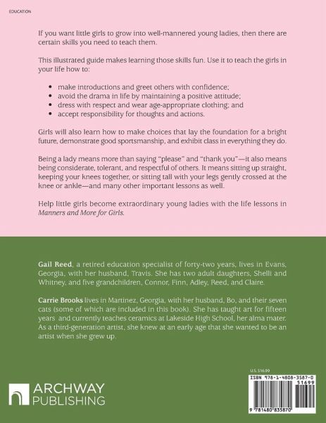 If you want little girls to grow into well-mannered young ladies, then there are certain skills you need to teach them. This illustrated guide makes learning those skills fun. Use it to teach the girls in your life how to: • make introductions and greet others with confidence; • avoid the drama in life by maintaining a positive attitude; • dress with respect and wear age-appropriate clothing; and • accept responsibility for thoughts and actions. Girls will also learn how to make choices that lay the foundation for a bright future, demonstrate good sportsmanship, and exhibit class in everything they do. Being a lady means more than saying "please" and "thank you"-it also means being considerate, tolerant, and respectful of others. It means sitting up straight, keeping your knees together, or sitting tall with your legs gently crossed at the knee or ankle-and many other important lessons as well. Help little girls become extraordinary young ladies with the life lessons in Manners and More for Girls.