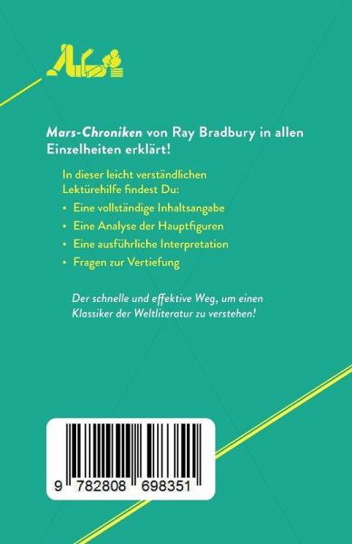 Was sollte man aus Mars-Chroniken, dem Gründungsklassiker der Science-Fiction, lernen? Hier finden Sie alles, was Sie über dieses Werk wissen müssen, in einer umfassenden und detaillierten Analyse. In dieser Karteikarte finden Sie unter anderem: - Eine vollständige Zusammenfassung - Eine Vorstellung der Hauptfiguren wie Kapitän Wilder oder Jeff Spender. - Eine Analyse der Besonderheiten des Werks : Science-Fiction als literarisches Genre; Eine scharfe Neuinterpretation der Kolonialisierung Amerikas; Ein pazifistischer und humanistischer Roman. Eine Referenzanalyse, um die Bedeutung des Werks schnell zu verstehen.