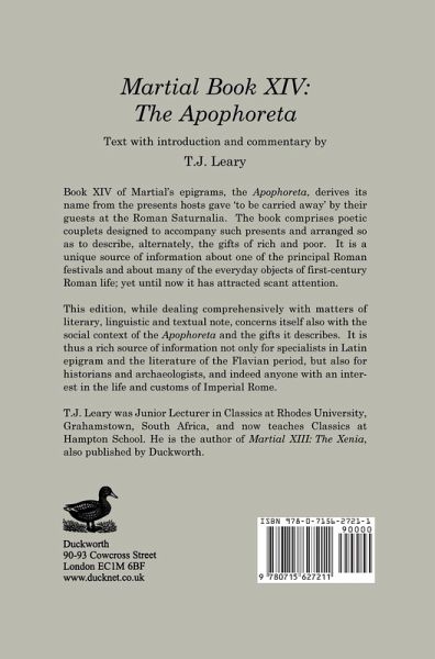 Book XIV of Martial's epigrams, the Apophoreta, derives its name from the presents hosts gave 'to be carried away' by their guests at the Roman Saturnalia. The book comprises poetic couplets designed to accompany such presents and arranged so as to describe, alternately, the gifts of rich and poor. It is a unique source of information about one of the principal Roman festivals and about many of the everyday objects of first-century Roman life; yet until now it has attracted scant attention. This edition, while dealing comprehensively with matters of literary, linguistic and textual note, concerns itself also with the social context of the Apophoreta and the gifts it describes. It is a rich source of information not only for specialists in Latin epigram and the literature of the Flavian period, but also for historians and archaeologists, and indeed anyone with an interest in the life and customs of Imperial Rome.