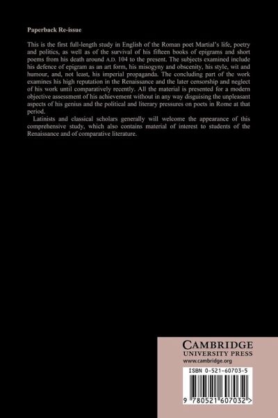 This is the first full-length study in English of the Roman poet Martial's life, poetry and politics, as well as of the survival of his fifteen books of epigrams and short poems from his death around AD 104 to the present. The subjects examined include his defence of epigram as an art form, his misogyny and obscenity, his style, wit and humour, and, not least, his imperial propaganda. The concluding part of the work examines his high reputation in the Renaissance and the later censorship and neglect of his work until comparatively recently. All the material is presented for a modern objective assessment of his achievement, without in any way disguising the unpleasant aspects of his genius, and the political and literary pressures on poets in Rome at that period.