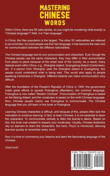 Have you been wanting to learn Chinese but can't find an effective way to increase your vocabulary? Are you tired of boring textbooks containing complicated grammar that you don't really need to get started? Would you like to learn the Chinese language fast by taking a more practical approach? If you answered yes to at least one of these questions, then you're in the right place! This book contains 2500 of the most common Chinese words so you can get a head start compared to those still learning Chinese in a more traditional way. Usually, Chinese textbooks rely on learners to learn the characters. But here, Pinyin is introduced, allowing learners to quickly remember every word. As you will discover, these words will be more than enough for your travels, and you'll start to be able to have conversations in Chinese. This book is well organized with basic words making up part 1 of the book so you can use those simpler words as building blocks for part 2 of the book, which contains words that will increase your Chinese skills even further. Ready to give it a go? Start right away! You'll feel the difference... and everyone else will notice too! Scroll up and click the "add to cart" button now to get started!