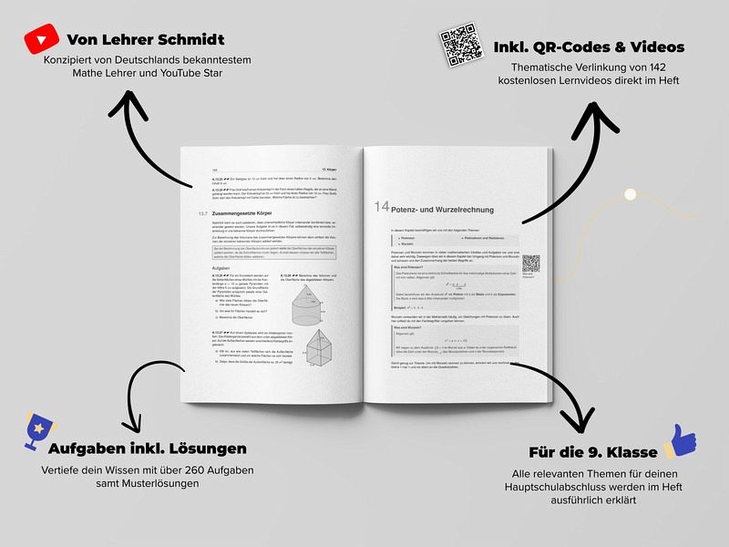 Ein weiterer Teil aus der Reihe von StudyHelp und Deutschlands Lieblingslehrer "Lehrer Schmidt". Dieses 184 Seiten starke Lernheft bietet dir schülerverständliche Erklärungen sowie über 260 Aufgaben zum selber rechnen für deine Vorbereitung auf den Abschluss nach der 9. Klasse Hauptschule. Vermeintlich komplexe Inhalte werden im Heft kurz und knackig in Kombination mit 142 Lernvideos von Lehrer Schmidt erklärt. Aufbauend auf die Theorie stehen Aufgaben mit verschiedenen Schwierigkeitsgraden im Fokus, die das erlernte Wissen vertiefen. Ausführliche Musterlösungen zu jeder Aufgabe helfen dir dabei, auf den ersten Blick schwierige Aufgaben zu lösen. Über einen kurzen Scan der im Heft abgedruckten QR-Codes mit dem Smartphone oder Tablet gelangst du direkt zu den passenden Erklärvideos von Lehrer Schmidt auf YouTube. Lerne auf diese Weise in deinem eigenen Tempo ¿ wann und wo du möchtest.