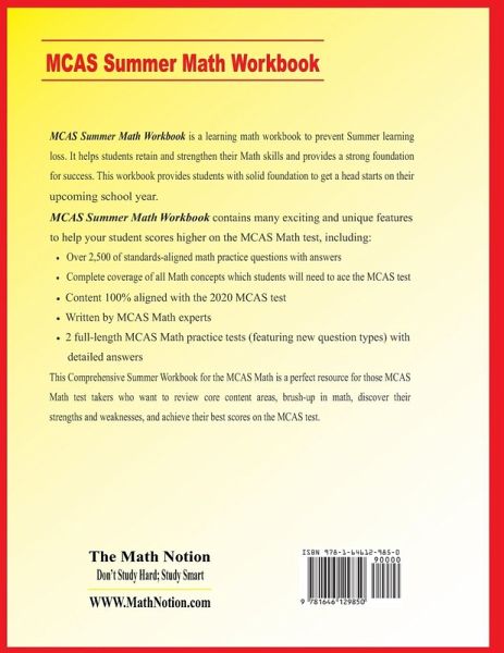 Prepare for the MCAS Math test with a perfect workbook! MCAS Summer Math Workbook is a learning math workbook to prevent Summer learning loss. It helps students retain and strengthen their Math skills and provides a strong foundation for success. This workbook provides students with solid foundation to get a head starts on their upcoming school year. MCAS Summer Math Workbook is designed by top test prep experts to help students prepare for the MCAS Math test. It provides test-takers with an in-depth focus on the math section of the test, helping them master the essential math skills that test-takers find the most troublesome. This is a prestigious resource for those who need an extra practice to succeed on the MCAS Math test in the summer. MCAS Summer Math Workbook contains many exciting and unique features to help your student scores higher on the MCAS Math test, including: * Over 2,500 of standards-aligned math practice questions with answers * Complete coverage of all Math concepts which students will need to ace the MCAS test * Content 100% aligned with the latest MCAS test * Written by MCAS Math experts * 2 full-length MCAS Math practice tests (featuring new question types) with detailed answers This Comprehensive Summer Workbook for the MCAS Math is a perfect resource for those MCAS Math test takers who want to review core content areas, brush-up in math, discover their strengths and weaknesses, and achieve their best scores on the MCAS test. Published By: The Math Notion www.mathnotion.com
