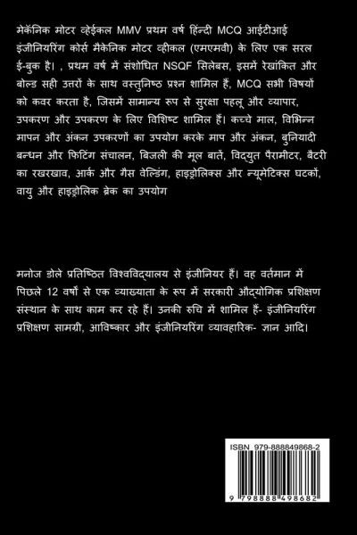 Mechanic Motor Vehicle First Year Hindi MCQ is a simple Book for ITI Engineering Course Mechanic Motor Vehicle (MMV) , First Year, Revised NSQF Syllabus, It contains objective questions with underlined & bold correct answers MCQ covering all topics including all about safety aspect in general and specific to the trade, tools & equipment, raw materials, Measuring & marking by using various Measuring & Marking tools, basic fastening and fitting operations, basics of electricity, electrical parameter, maintenance of batteries, various welding joints by using Arc and gas welding, hydraulics and pneumatics components, Air and Hydraulic Brake system, Diesel Engine of LMV, Cylinder Head , valve train , Piston, connecting rod assembly, crankshaft, flywheel and mounting flanges, spigot and bearings, camshaft, Cooling, lubrication, Intake & Exhaust system of Engine, diesel fuel system, FIP, Governor and monitor emission of vehicle, Starter, alternator and perform Execute troubleshooting in engine of LMV/HMV and lots more.