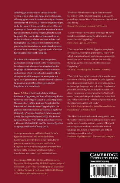Middle Egyptian introduces the reader to the writing system of ancient Egypt and the language of hieroglyphic texts. It contains twenty-six lessons, exercises (with answers), a list of hieroglyphic signs, and a dictionary. It also includes a series of twenty-six essays on the most important aspects of ancient Egyptian history, society, religion, literature, and language. Grammar lessons and cultural essays allows users not only to read hieroglyphic texts but also to understand them, providing the foundation for understanding texts on monuments and reading great works of ancient Egyptian literature. This third edition is revised and reorganized, particularly in its approach to the verbal system, based on recent advances in understanding the language. Illustrations enhance the discussions, and an index of references has been added. These changes and additions provide a complete and up-to-date grammatical description of the classical language of ancient Egypt for specialists in linguistics and other fields.
