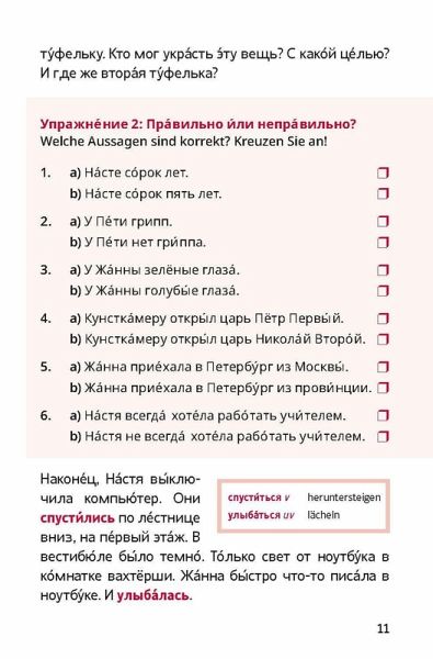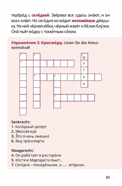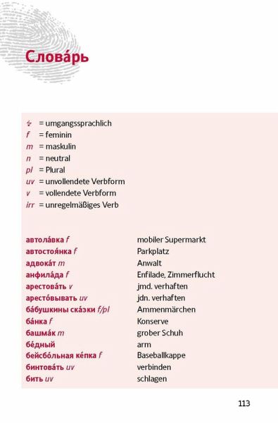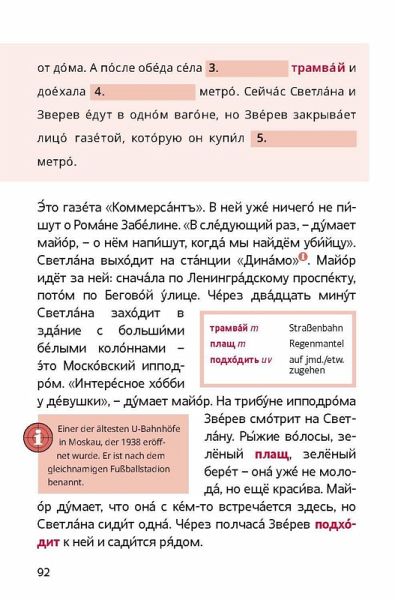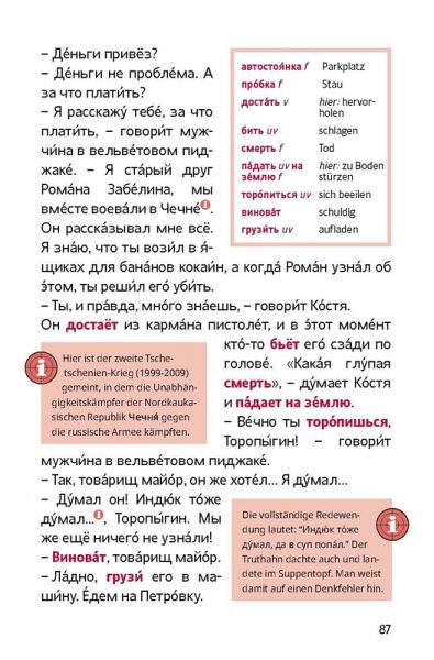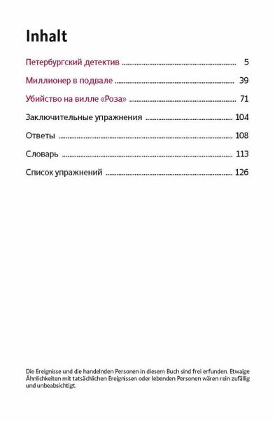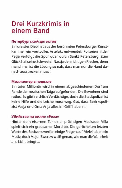 3 spannende Krimis auf Russisch: Schlüpfen Sie in die Rollen der Ermittler_innen und verbessern Sie Ihre Russisch-Kenntnisse ganz intuitiv. Muttersprachliche Autor_innen: Unsere Texte wurden von Muttersprachler_innen speziell für das Niveau A1 verfasst. Über 40 textbezogene Übungen: Die eingebundenen Übungen steigern die Lernfähigkeit und gliedern sich spielerisch in den Lesefluss ein. Betonungszeichen: so lernen Sie nebenher die richtige Aussprache russischer Wörter. Vokabelangaben auf jeder Seite: Schwierige Wörter werden auf jeder Seite angegeben und sind ohne umständliches Blättern sofort griffbereit. Umfangreiches Glossar: Das alphabetische Glossar am Ende des Buches ermöglicht es, die Wörter aus allen Texten auch nachträglich nachzuschlagen. Infokästen zu Sprache und Grammatik: Zusätzliche Informationen, Tipps und Wissenswertes zu Sprache, Grammatik und Landeskunde ergänzen Ihren Lernkrimi Kurzkrimi "Millioner w podwale". Ansprechendes Layout: Das moderne, lockere Design überzeugt sowohl auf dem Cover als auch im Innenteil.