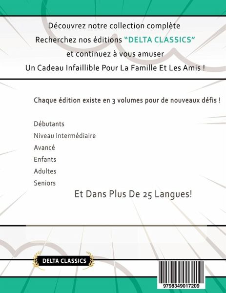* DELTA CLASSICS - MOTS MÊLÉS EN ESPAGNOL POUR LES ADULTES, VOL.1 (GRANDS CARACTÈRES) - 100 Grilles De Jeux Des Plus Captivantes ! + BONUS SUPPLÉMENTAIRES Des Heures De Détente Avec Un Livre de Mots Mêlés de Qualité et Facile à Lire. Découvrez 100 Puzzles Anti-stress Pour Développer Un Esprit Clair Et Affuté ! Un Cadeau Idéal Pour Pratiquer Une Langue. Trouvez 2000 Mots Cachés En ESPAGNOL. Par DELTA CLASSICS, Un Leader Mondial Dans L'Édition de Livres de Jeux. Avec + de 40 Heures De Divertissement - Le Livre Que Vous Cherchiez : - IMPRIMÉ SUR DU PAPIER HAUTE QUALITÉ : L'encre ne traverse pas (surligneurs ou feutres) - 100 GRILLES AU FORMAT A4 : Conçues pour la meilleure lisibilité possible - POUR TOUT ÂGE (15-99 ANS) : Plus de 2000 mots sélectionnés avec soin - FEUILLETEZ : Pas de mauvaises surprises, parcourez le livre en cliquant sur la couverture - SOLUTIONS SIMPLIFIÉES : Solutions disponibles dans un format simple et clair - FACILE & INTERMÉDIAIRE : Suffisamment difficile pour s’amuser et simple pour être divertissant - CADEAUX SUPPLÉMENTAIRES : Découvrez des BONUS Exclusifs ! Le Meilleur Choix Pour Cultiver un Esprit Agile en s’Amusant ! ------- [ENGLISH] ------- Note: Some content in English might be missing due to length restrictions. * DELTA CLASSICS - AWESOME WORD SEARCHES IN SPANISH FOR ADVANCED - VOL.1 - The Most Captivating Large Print Puzzles Available! + EXTRA FREEBIES INCLUDED Relax for Hours with this Easy to Read and Cleverly Crafted Puzzle Book! Enjoy a Premium Edition: 100 Stress-Relieving Puzzles to Promote a Sharp and Quick Brain! A Proven Gift to Practice Language. Hunt for over +2000 SPANISH Words in all Directions. From DELTA CLASSICS, a World Leader in Puzzle Book Publishing - A Delightful Time Guaranteed. With +40 Hours of Entertainment - This is The Book you were Looking for: - PRINTED ON HIGH-QUALITY PAPER: Use highlighters or pens, no bleed-through - LARGE PRINTS IN FULL PAGE FORMAT: Designed for the best readability possible - FUN FOR ALL AGES (15-99 YEARS): Enjoy a curated selection of +2000 words - BOOK PREVIEW AVAILABLE: No surprise, click on the cover to Look inside the book - QUICK FIND: Solutions in a clear and simple format at the end of the book - EASY & INTERMEDIATE LEVEL: Difficult enough to be challenging, easy enough to be addictive - EXTRA BONUS: Uncover our Exclusive Freebies Get it Now, Start Having Fun & Sharpen Your Brain!