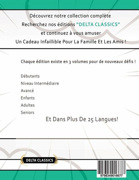* DELTA CLASSICS - MOTS MÊLÉS EN PORTUGAIS NIVEAU INTERMÉDIAIRE, VOL.1 (GRANDS CARACTÈRES) - 100 Grilles De Jeux Des Plus Captivantes ! + BONUS SUPPLÉMENTAIRES Des Heures De Détente Avec Un Livre de Mots Mêlés de Qualité et Facile à Lire. Découvrez 100 Puzzles Anti-stress Pour Développer Un Esprit Clair Et Affuté ! Un Cadeau Idéal Pour Pratiquer Une Langue. Trouvez 2000 Mots Cachés En PORTUGAIS. Par DELTA CLASSICS, Un Leader Mondial Dans L'Édition de Livres de Jeux. Avec + de 40 Heures De Divertissement - Le Livre Que Vous Cherchiez : - IMPRIMÉ SUR DU PAPIER HAUTE QUALITÉ : L'encre ne traverse pas (surligneurs ou feutres) - 100 GRILLES AU FORMAT A4 : Conçues pour la meilleure lisibilité possible - POUR TOUT ÂGE (15-99 ANS) : Plus de 2000 mots sélectionnés avec soin - FEUILLETEZ : Pas de mauvaises surprises, parcourez le livre en cliquant sur la couverture - SOLUTIONS SIMPLIFIÉES : Solutions disponibles dans un format simple et clair - FACILE & INTERMÉDIAIRE : Suffisamment difficile pour s’amuser et simple pour être divertissant - CADEAUX SUPPLÉMENTAIRES : Découvrez des BONUS Exclusifs ! Le Meilleur Choix Pour Cultiver un Esprit Agile en s’Amusant ! ------- [ENGLISH] ------- Note: Some content in English might be missing due to length restrictions. * DELTA CLASSICS - AWESOME WORD SEARCHES IN PORTUGUESE FOR ADULTS - VOL.1 - The Most Captivating Large Print Puzzles Available! + EXTRA FREEBIES INCLUDED Relax for Hours with this Easy to Read and Cleverly Crafted Puzzle Book! Enjoy a Premium Edition: 100 Stress-Relieving Puzzles to Promote a Sharp and Quick Brain! A Proven Gift to Practice Language. Hunt for over +2000 PORTUGUESE Words in all Directions. From DELTA CLASSICS, a World Leader in Puzzle Book Publishing - A Delightful Time Guaranteed. With +40 Hours of Entertainment - This is The Book you were Looking for: - PRINTED ON HIGH-QUALITY PAPER: Use highlighters or pens, no bleed-through - LARGE PRINTS IN FULL PAGE FORMAT: Designed for the best readability possible - FUN FOR ALL AGES (15-99 YEARS): Enjoy a curated selection of +2000 words - BOOK PREVIEW AVAILABLE: No surprise, click on the cover to Look inside the book - QUICK FIND: Solutions in a clear and simple format at the end of the book - EASY & INTERMEDIATE LEVEL: Difficult enough to be challenging, easy enough to be addictive - EXTRA BONUS: Uncover our Exclusive Freebies Get it Now, Start Having Fun & Sharpen Your