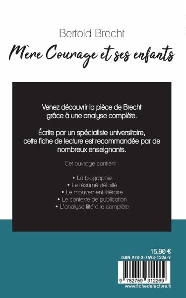 Venez découvrir Mère Courage et ses enfants de Bertold Brecht grâce à une analyse littéraire de référence ! Écrite par un spécialiste universitaire, cette fiche de lecture est recommandée par de nombreux enseignants. Cet ouvrage contient la biographie de l'écrivain, le résumé détaillé, le mouvement littéraire, le contexte de publication de l'oeuvre et l'analyse complète. Retrouvez tous nos titres sur : www.fichedelecture.fr.