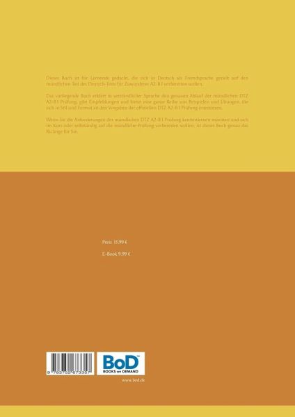 Dieses Buch ist für Lernende gedacht, die sich in Deutsch als Fremdsprache gezielt auf den mündlichen Teil des Deutsch-Tests für Zuwanderer A2-B1 vorbereiten wollen.Das vorliegende Buch erklärt in verständlicher Sprache den genauen Ablauf der mündlichen DTZ A2-B1 Prüfung, gibt Empfehlungen und bietet eine ganze Reihe von Beispielen und Übungen, die sich in Stil und Format an den Vorgaben der offiziellen DTZ A2-B1 Prüfung orientieren.Wenn Sie die Anforderungen der mündlichen DTZ A2-B1 Prüfung kennenlernen möchten und sich im Kurs oder selbständig auf die mündliche Prüfung vorbereiten wollen, ist dieses Buch genau das Richtige für Sie.