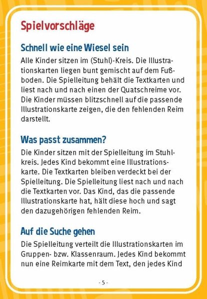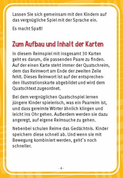 Paarreime ohne Sinn, aber mit viel Sprachwitz: Ein Sprachspiel für Kinder im GrundschulalterPerfekt auch für Logopädie-ÜbungenMit lustigen Quatschreimen das phonologische Bewusstsein fördernKartenset mit Reimen und Bildern inkl. Begleitheft mit SpielvorschlägenSpielerische Sprachförderung zu Hause und in der Schule: Sprachwitz trifft Sprachrhythmus