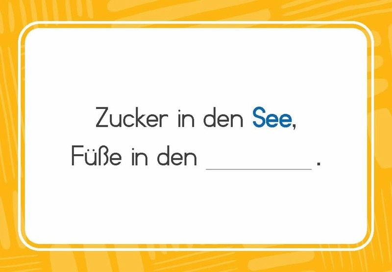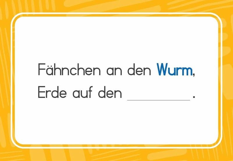 Stöckchen in den Mund, Rotkohl für den ...? Konfetti für den Fisch, Würmer auf den ...? Die Paarreime in diesem Spiel zur Sprachförderung müssen keinen Sinn ergeben - sie müssen bloß Spaß machen! Aber jedem Quatschreim fehlt am Ende der zweiten Zeile das passende Reimwort. Diese Reimwörter sind auf den Illustrationskarten abgebildet und die Aufgabe der Kinder ist es, die Karten einander zuzuordnen: Kichern ist selbstverständlich erlaubt!