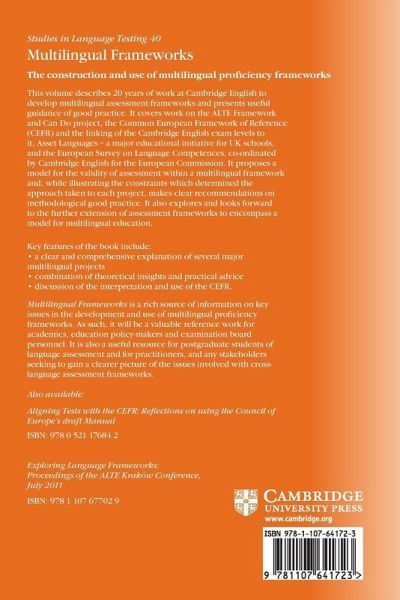 Multilingual Frameworks covers the development of the ALTE Framework and 'Can Do' project; work on the Common European Framework of Reference and the linking of the Cambridge English exam levels to it; Asset Languages - a major educational initiative for UK schools; and the European Survey on Language Competences. It proposes a model for the validity of assessment within a multilingual framework, and while illustrating the constraints which determined the approach taken to each project, makes clear recommendations on methodological good practice. It looks forward to the further extension of assessment frameworks to encompass a model for multilingual education.