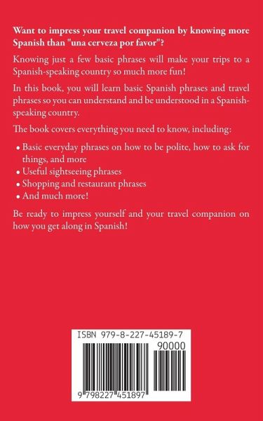 Want to impress your travel companion by knowing more Spanish than "una cerveza por favor"? Knowing just a few basic phrases will make your trips to a Spanish-speaking country so much more fun! In this book, you will learn basic Spanish phrases and travel phrases so you can understand and be understood in a Spanish-speaking country. The book covers everything you need to know, including: Basic everyday phrases on how to be polite, how to ask for things, and more Useful sightseeing phrases Shopping and restaurant phrases And much more! Be ready to impress yourself and your travel companion on how you get along in Spanish!