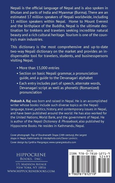 Nepali is the official language of Nepal and is also spoken in Bhutan and parts of India and Myanmar (Burma). There are an estimated 17 million speakers of Nepali worldwide, including 11 million speakers within Nepal. Home to Mount Everest and the birthplace of the Buddha, Nepal is the ultimate destination for trekkers and travelers seeking incredible natural beauty and a rich cultural heritage. Tourism is one of the country's main industries. This dictionary is the most comprehensive and up-to-date two-way Nepali dictionary on the market and provides an indispensable tool for travelers, students, and businesspersons visiting Nepal. More than 15,000 entries Section on basic Nepali grammar, a pronunciation guide, and a guide to the Devanagari alphabet Each entry includes part of speech, alternate words, Devanagari script as well as phonetic (Romanized) pronunciation