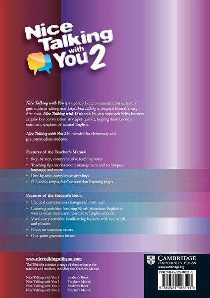 Nice Talking with You is a two-level oral communication series designed to get students talking. The Teacher's Manual features step-by-step comprehensive teaching note; teaching tips on classroom management techniques, language and more; unit-by-unit, complete answer keys; and full audio scripts for the Conversation listening pages.