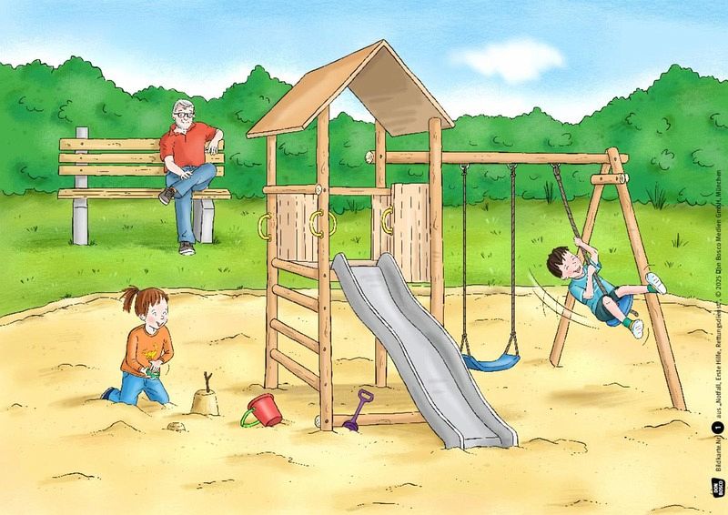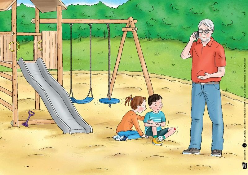 In dieser lebensnahen Sachgeschichte für das Erzähltheater erklärt Silke Bicker in einfachen Worten, wie man sich im Notfall richtig verhält, ein Dreieckstuch anlegt oder jemanden in die stabile Seitenlage bringt.