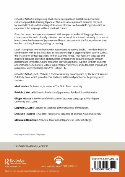 Level 1 comprises two textbooks with accompanying activity books. These four books in combination with audio files allow instructors to adapt a beginning-level course, such as the first year of college Japanese, to their students' needs. They focus on language and modeled behavior, providing opportunities for learners to acquire language through performance templates. Online resources provide additional support for both students and instructors. Audio files, videos, supplementary exercises, and a teachers' manual are available at www.routledge.com/9781138304147.