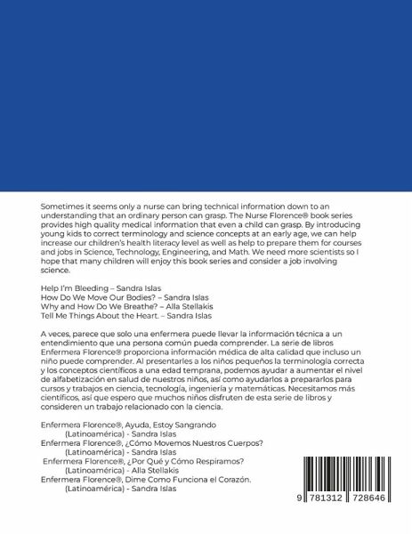 Sometimes it seems only a nurse can bring technical information down to an understanding that an ordinary person can grasp. The Nurse Florence® book series provides high quality medical information that even a child can grasp. By introducing young kids to correct terminology and science concepts at an early age, we can help increase our children's health literacy level as well as help to prepare them for courses and jobs in Science, Technology, Engineering, and Math. We need more scientists so I hope that many children will enjoy this book series and consider a job involving science. Help I'm Bleeding - Sandra Islas How Do We Move Our Bodies? - Sandra Islas Why and How Do We Breathe? - Alla Stellakis Tell Me Things About the Heart. - Sandra Islas A veces, parece que solo una enfermera puede llevar la información técnica a un entendimiento que una persona común pueda comprender. La serie de libros Enfermera Florence® proporciona información médica de alta calidad que incluso un niño puede comprender. Al presentarles a los niños pequeños la terminología correcta y los conceptos científicos a una edad temprana, podemos ayudar a aumentar el nivel de alfabetización en salud de nuestros niños, así como ayudarlos a prepararlos para cursos y trabajos en ciencia, tecnología, ingeniería y matemáticas. Necesitamos más científicos, así que espero que muchos niños disfruten de esta serie de libros y consideren un trabajo relacionado con la ciencia. Enfermera Florence®, Ayuda, Estoy Sangrando (Latinoamérica) - Sandra Islas Enfermera Florence®, ¿Cómo Movemos Nuestros Cuerpos? (Latinoamérica) - Sandra Islas Enfermera Florence®, ¿Por Qué y Cómo Respiramos? (Latinoamérica) - Alla Stellakis Enfermera Florence®, Dime Como Funciona el Corazón. (Latinoamérica) - Sandra Islas