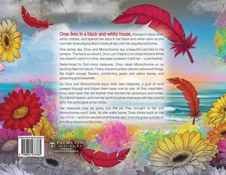 Onyx Pearl lives a black-and-white life with her shades-of-gray dog Monochrome. But while playing fetch inside with Monochrome one day, something special happens. Onyx lives in a black-and-white house, dresses in black-and-white clothes, and plays fetch inside in her black-and-white room with Monochrome as she normally does. Little does she know, today is no ordinary day. While playing fetch, Onyx and Monochrome come across a beautiful red bird. The hue is so vibrant, Onyx can't help but to chase the bird! While she doesn't catch it in time, she sees a present it left her - a red feather. Determined to find more treasures, Onyx takes Monochrome on an exciting hike into nature. There, she encounters vibrant colors and things, like bright orange flowers, comforting green and yellow leaves, and glistening gold seashells. However, as Onyx and Monochrome enjoy their new treasures, a gust of wind sweeps through and blows them away one by one. At first crestfallen, Onyx soon sees the red feather that started her adventure and smiles. Accidents happen, and now her spirit's brighter than ever with the colorful gifts the world gave to her today. Onyx Pearl is a beautiful, engaging story for children between the ages of 8 and 10. Filled with striking illustrations and vivid colors, the children's book promises to become a bedtime favorite.
