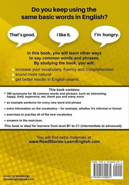 Do you keep using the same basic words in English? "That's good." "I like that." "I'm very hungry." Take your English to the next level with this book. You will:increase your vocabulary, fluency and comprehension sound more natural get better results in English exams. This book contains:300 synonyms in British English for 50 common words and phrases, such as interesting, happy, tired, expensive, eat, thank you and many more an example sentence for every new word and phrase extra information on the vocabulary - for example, whether it's informal (slang) or formal exercises to practise all of the new vocabulary answers to the exercises. This workbook is suitable for both classroom use and self-study. It is ideal for learners from level B1 to C1 (intermediate to advanced).