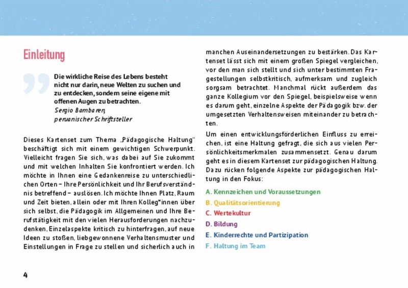 Das Kartenset zur pädagogischen Grundhaltung bieteteine Fülle von Möglichkeiten, im Kita-Team ins Gespräch und in den Erfahrungsaustausch zu kommen. Die gemeinsame berufliche Weiterentwicklung steht hier klar im Fokus. Das Begleitheft beleuchtet u.a. die Bedeutung des Wortes Haltung. Die Bildkarten sind nach Themengebieten geordnet: Es geht zum Beispiel um die Voraussetzung für pädagogische Haltung, Qualitätsorientierung in Kitas, die Werte und das Bildungsverständnis der pädagogischen Fachkräfte. Die Selbstreflexion kann dem Team helfen, gemeinsame Standards zu erarbeiten und zu leben!