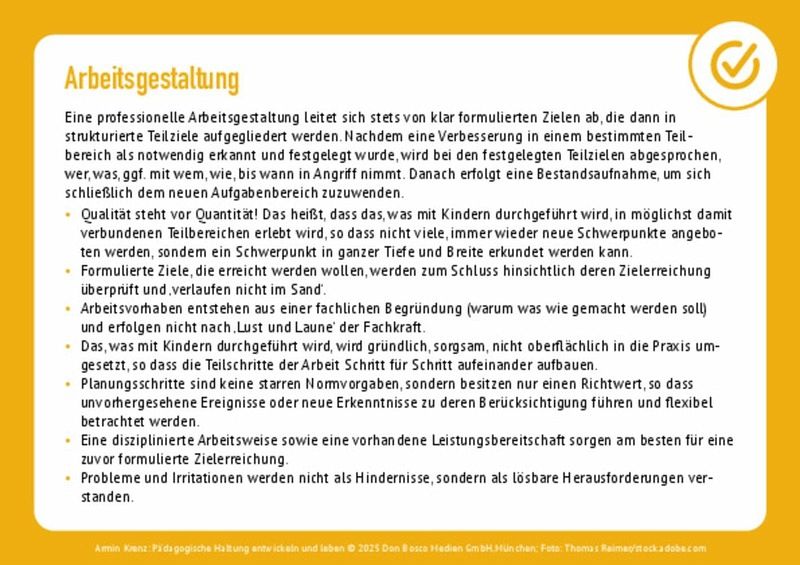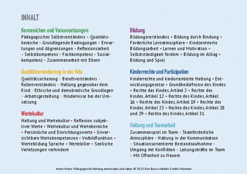 Das Selbstverständnis von Erzieherinnen und Erziehern, ihre pädagogische Grundhaltung, ist nicht statisch - es entwickelt sich ständig weiter. Deswegen ist die Selbstreflexion der Erzieher:innen ein wichtiger Baustein in ihrer Arbeit. Armin Krenz, Honorarprofessor für Entwicklungspsychologie und Elementarpädagogik, gibt pädagogischen Fachkräften mit dem Kartenset eine wichtige Handreichung für ihre innere Haltung im Beruf.